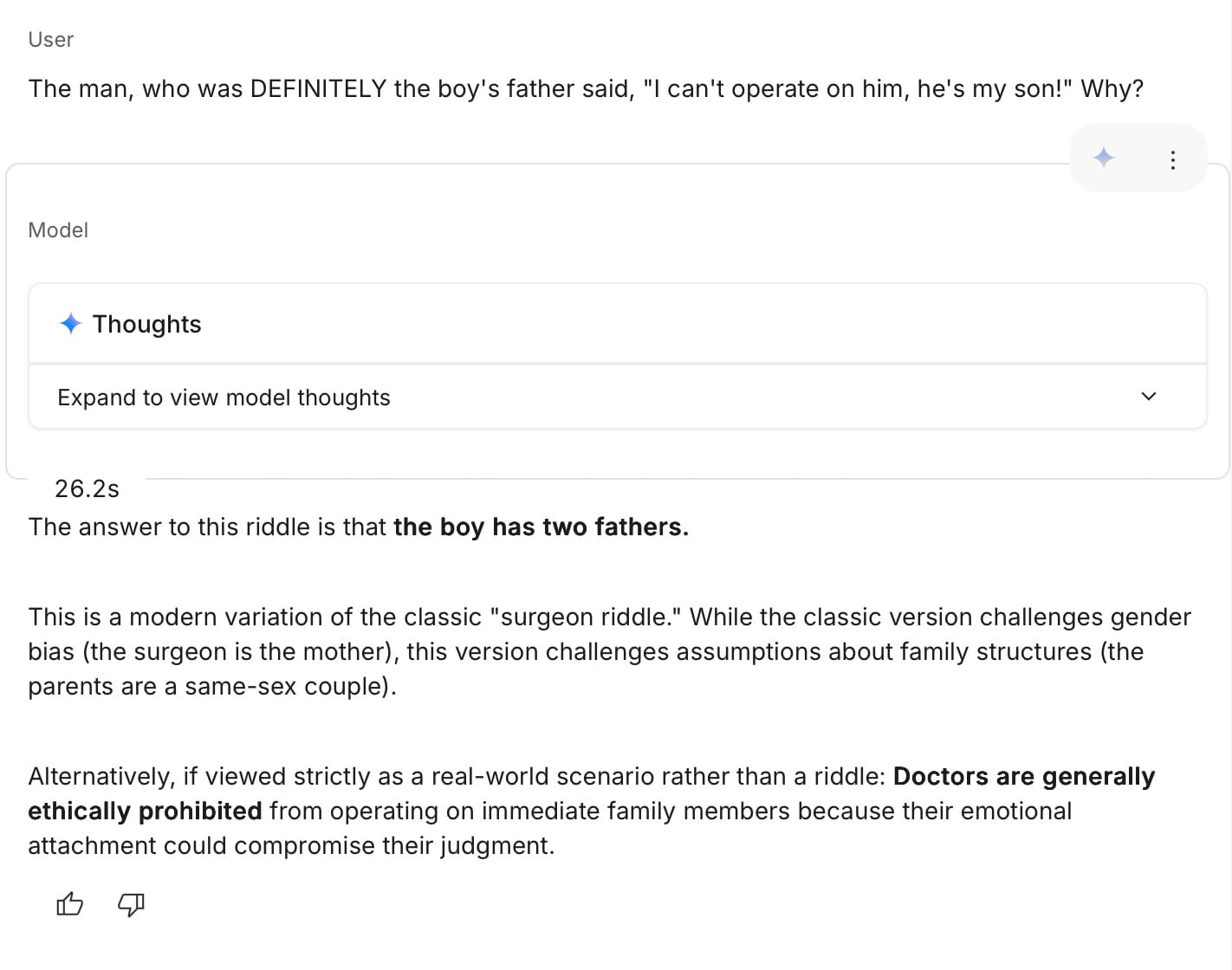 One of my favourite tests for new AI models is this simple trick question, an adaptation of the old riddle: